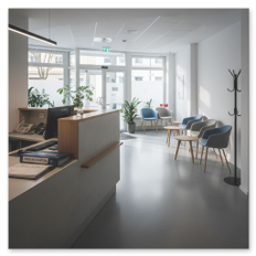 Unsere Praxis ist stufenfrei zugänglich. Ein Aufzug führt zu den Praxisräumen, Türen sind breit und der Empfang ist gut erreichbar.